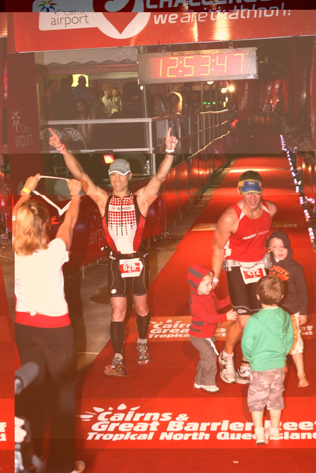 Once that is done the process continues; nappy cream on vital points of contact – check, specifically designed nipple protection bandages – applied – check. Sunblock – on the face – not above the eyes – check (critical error here – North QLD sun, middle of the day, sunburn, aaghh, it burns my shoulders and back, damn it). Deodorant – no need – I’ll be moving too fast to sweat near anyone – no check. Compression shorts – not yet – at the transition site pre-wetsuit – check. Brightly coloured tri-singlet – zip – check. Street clothes, tri-thongs, tri-bags, tri-hat, bottle of tri-juice – all systems are go!